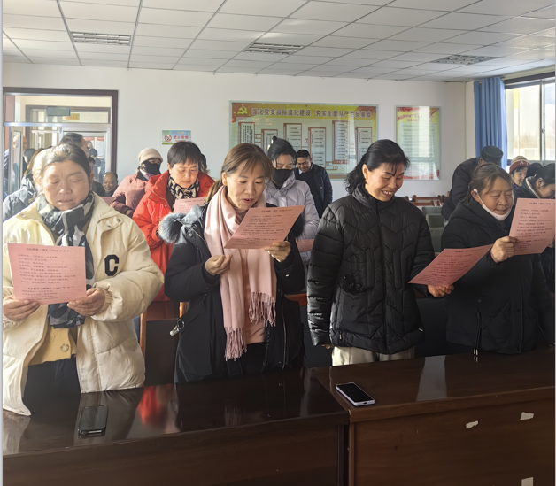 活动尾声,在王晓梅的带领下,全体村民齐声朗诵毛泽东同志的《七律・长征》。“红军不怕远征难,万水千山只等闲……”激昂的诗句在活动现场回荡,村民们虽不是专业朗诵者,但每一句都饱含热忱,从略显生涩到逐渐流畅,从独自跟读至齐声共鸣,红色经典的力量与普通话的凝聚力在此刻交融。
